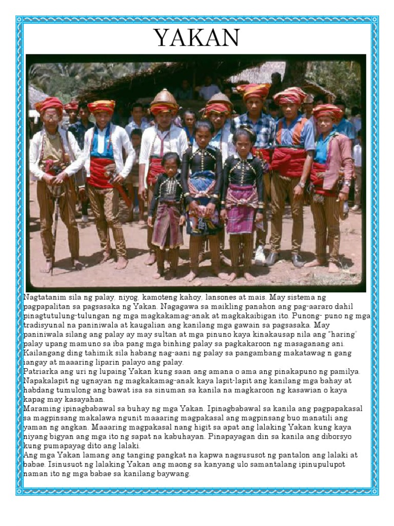 Pangkat etniko ng mga yakan. 1 Identify and briefly explain two known social political or. Anung wika ng mga yakan at manobo. Ang tinatawag na mga pangkat-etniko sa Pilipinas ay maaaring ipakahulugan na isang pag-uuri o sarilinang pagkakakilanlan ng mga Pilipino batay sa kanilang lipi wika relihiyon o kasaysayan.